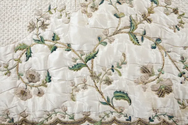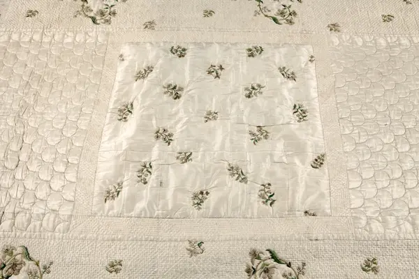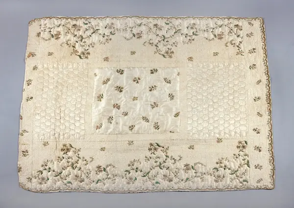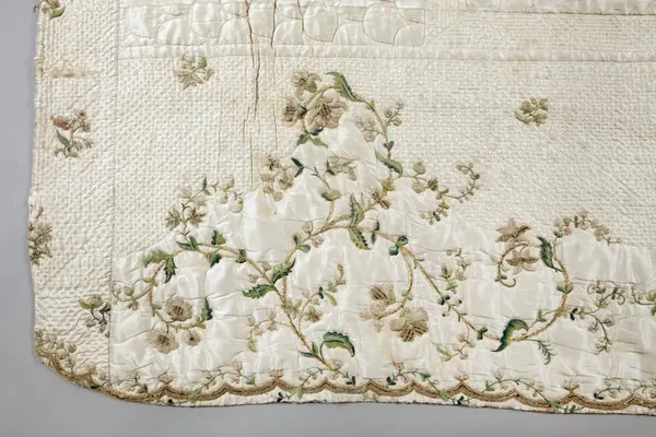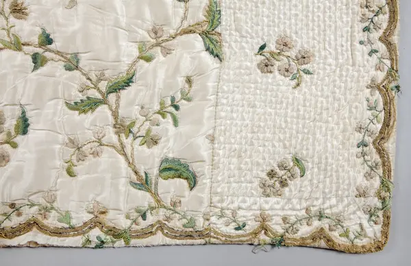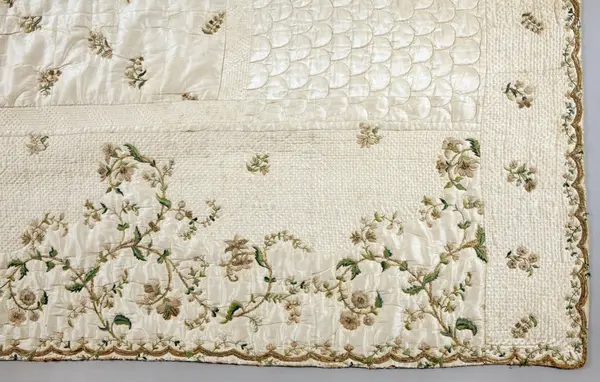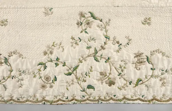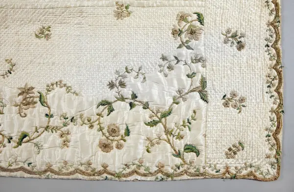 Broderat sidentäcke, troligen från slutet av 1700-talet, som tillhört familjen Nisbeth på Tisslinge gård, Östuna socken, Uppland.