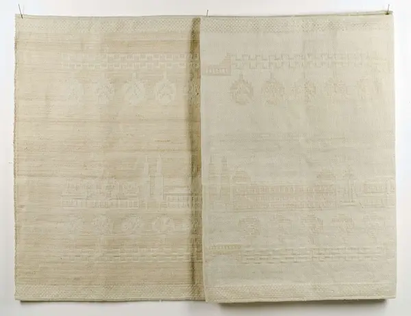 Tre vävprov och en duk som tillhör den så kallade hemslöjdssamlingens B-samling som samlades in av Uppsala läns hemslöjdsförening under åren 1916-1993.