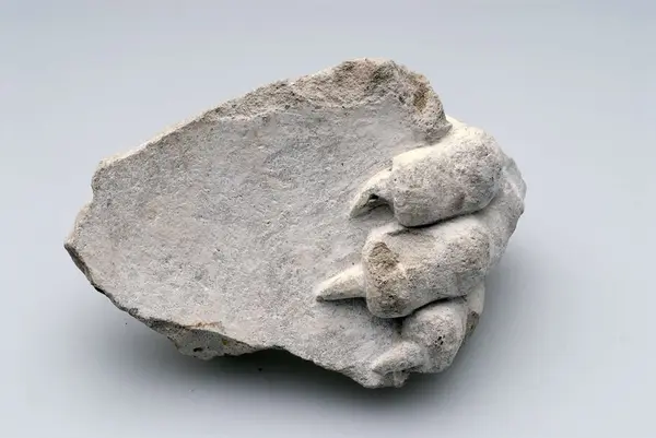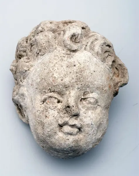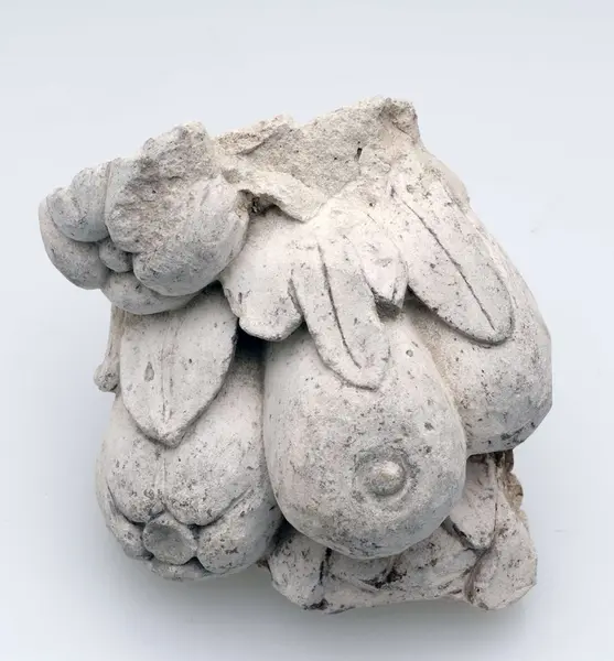- 11 vitgrå stuckaturfragment föreställande änglar, frukter, dekorationslister, lejontassar och människor.
