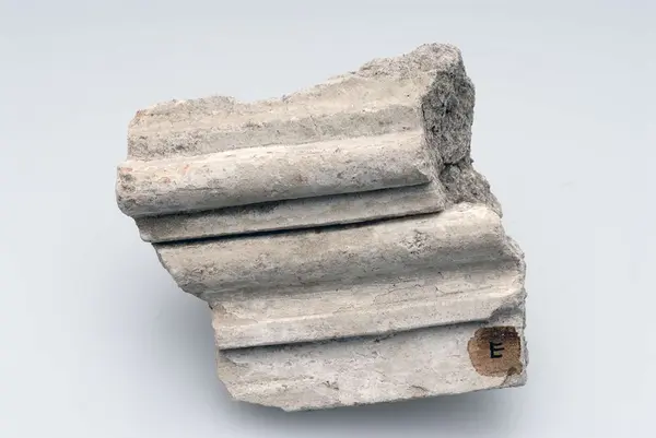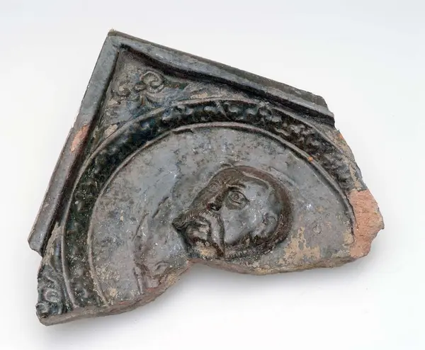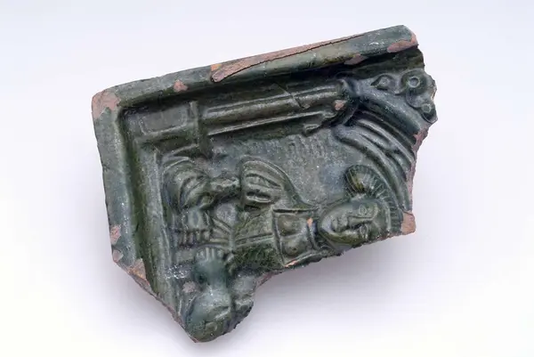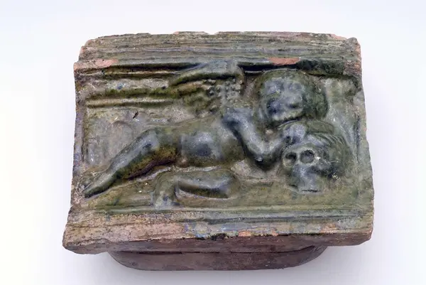 - Tre större grönglaserade kakelfragment från kakelugn . Kakelplattorna är dekorerade med en kvinnofigur, en putti med dödskalle och kungafigur.