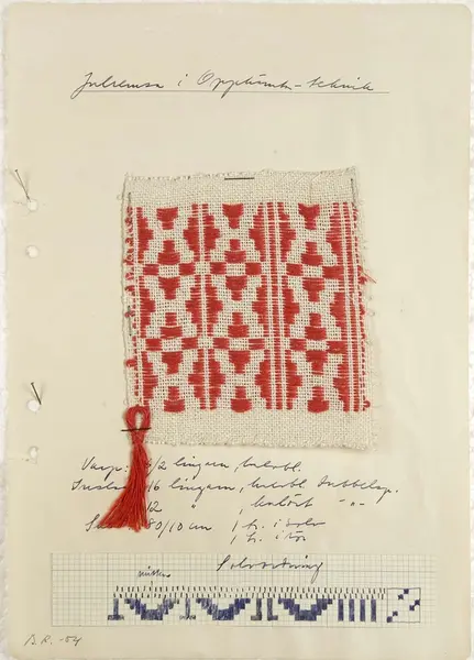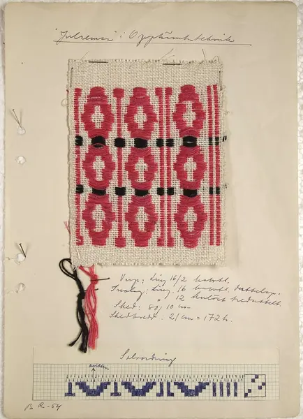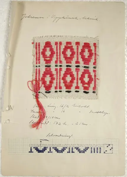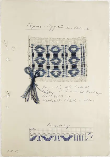 Vävproven tillhör den så kallade hemslöjdssamlingen som deponerades på Upplandsmuseet 1981-12-21 av Uppsala läns hemslöjdsförening och skänktes till Upplandsmuseet 1994-06-01 av Hemslöjdsföreningen i Uppsala län.