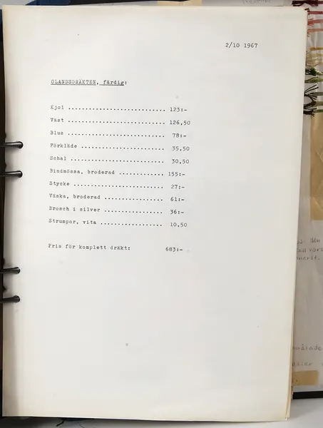 - Materialet tillhör den så kallade hemslöjdssamlingen som deponerades på Upplandsmuseet 1981-12-21 av Uppsala läns hemslöjdsförening och skänktes till Upplandsmuseet 1994-06-01 av Hemslöjdsföreningen i Uppsala län.