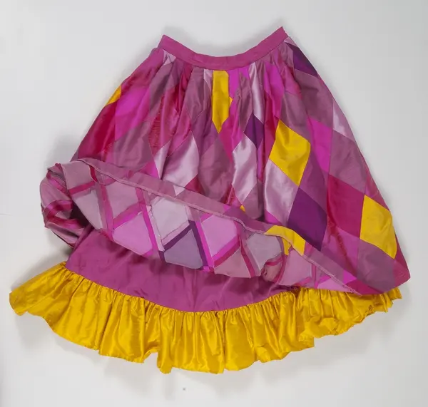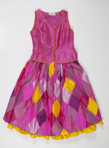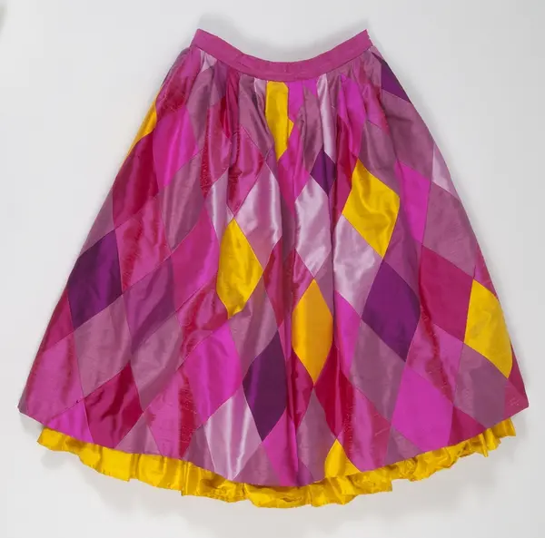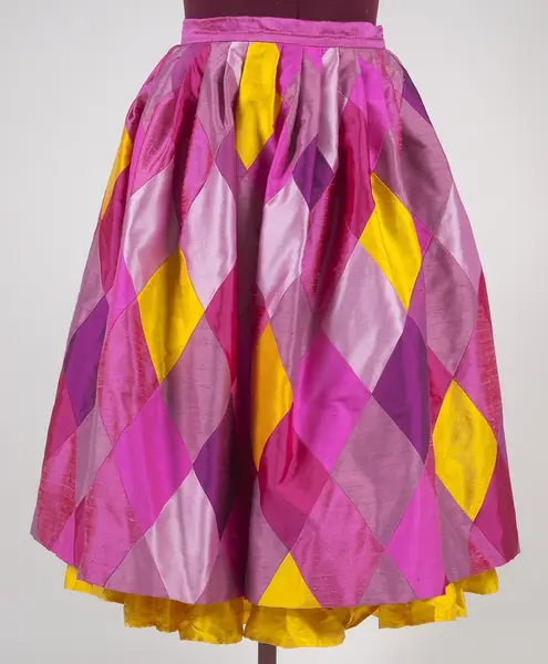 Kjol designad av Vanja Brunzell. Vid sidan av snörmakerier var harlekinrutor något som utmärkte Vanja Brunzells design. Med lite pengar på fickan skapades de första harlekinkläderna av billiga stuvbitar. Detta utvecklades så småningom till alltmer avancerad rutteknik. Kjolen, UM42708, hör samman med ett liv, UM42707. Dräkten fick heta Harlekin.