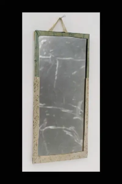 Fönster av spegelglas, grönt papper uppklistrat på baksidan. Vita upphängningsband. Placerade i dockskåpets översta våning. Tillhör dockskåp inv 200.513.