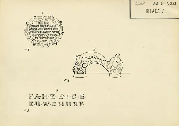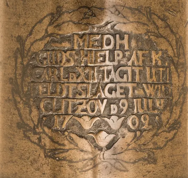 Tappstycket: Omedelbart framför bakfrisen inskriptionen (ingraverat): 02 eller 22 Obs! den första siffran - om det över huvud taget är någon siffra - är i det närmaste utplånad, varför tydningen ej är säker. På den vänstra tappens fria ända finns inskriptionen (ingraverat): 378 (dessa siffror torde ej vara ursprungliga). Långa fältet: Strax framför frambandet: en bladkartusch (ingraverat) och inuti denna följande inskription (bokstäverna är utsparade på den sänkta botten): MEDH / GUDS HIELP AF K. / CARL D XII TAGIT UTI / FELDTSLAGET WID / CLITZOV ) IULY / 17 02 Trumfen: trumpetförstärkt.