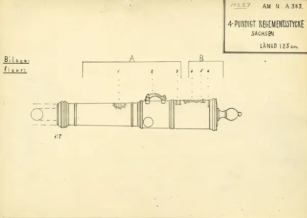 Enligt inskription erövrad från sachsarna i slaget vid Clissow 1702. Kanonen är ett enkelt eldrör. Druvan är svagt spets-kulformig och längst bak försedd med en rund knopp.