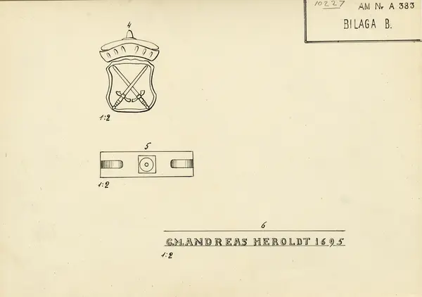 Bottenstycket: Omedelbart framför kammarsiraterna inskriptionen .G.M.ANDREAS.HEROLD.1696. Obs! de båda sista bokstäverna i Herold är delvis utnötta. (Goss mich Andreas Herold 1696 = Andreas Herold göt mig 1696).