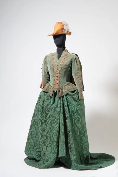 Denne drakten ble brukt av Aase Bye i rollen som Elisabeth I i Nationaltheatrets oppsetning av Friedrich von Schillers stykke "Maria Stuart" fra 1953. Det var Lita Prahl (1905–1978) og Alef Rasen som sto for kostymedesignen i denne oppsetningen.