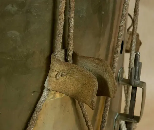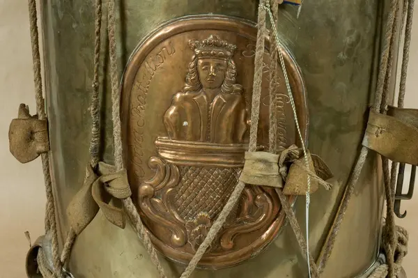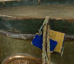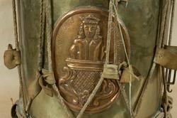 Gjord av mässingsplåt med grönmålade träramar. Snörad. Snarrsträngar har funnits, men saknas nu. Vingskruven, med hållare, för dessas spännande finns dock kvar. På hållaren är ingraverat: "Skänkt af P. (J) G. Bergman, Fendrich vid Borg.skapets Södra Bataile 5:te Comp. den 3 April 1764". Har en påsatt, oval kopparplå...