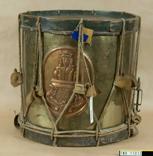 Gjord av mässingsplåt med grönmålade träramar. Snörad. Snarrsträngar har funnits, men saknas nu. Vingskruven, med hållare, för dessas spännande finns dock kvar. På hållaren är ingraverat: "Skänkt af P. (J) G. Bergman, Fendrich vid Borg.skapets Södra Bataile 5:te Comp. den 3 April 1764". Har en påsatt, oval kopparplåt med S:t Eriks bild, därikring är ingraverat: "Södra Batallions Femte Compagnie". Bärrem av brunt läder. Gåva från Borgerskapets militärkorpser. Tillhört Stockholms borgerskaps infanterikår./Mars 1939 A Lilliehöök.