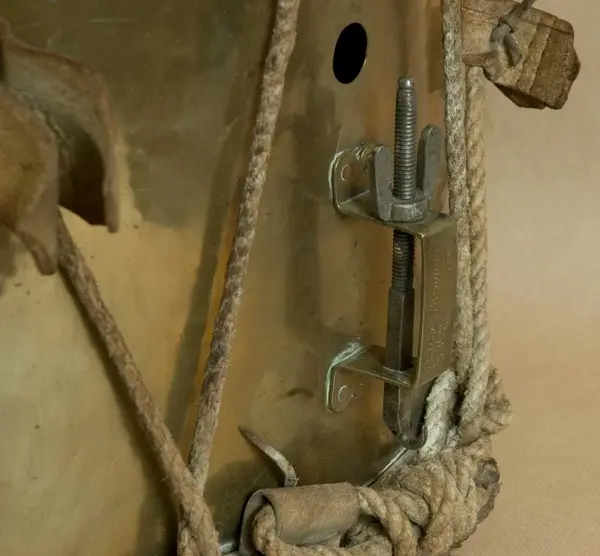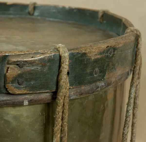 Gjord av mässingsplåt med grönmålade träramar. Snörad. Snarrsträngar har funnits, men saknas nu. Vingskruven, med hållare, för dessas spännande finns dock kvar. På hål...