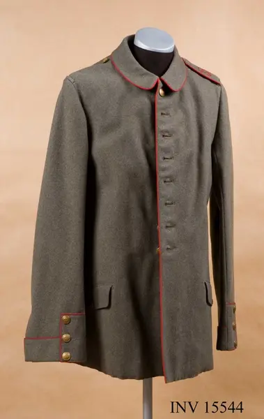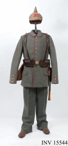 Regementet Nr 35 grundades år 1915. En fältgrå uniform infördes i tyska armén efter dagorder av den 18 mars 1910. Tillverkningen började i förväg; denna rock är gjord år 1908. Som "Ausmarschuniform" har den modellåret 1914. Röda passpoaler för infanteriregementena i III:e armékåren. Dessutom broderier av röd bomullstråd på axelklaffarna.