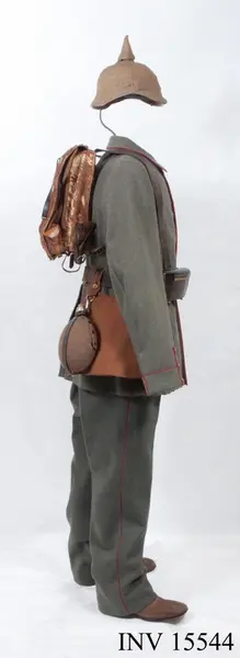 Ur uniform för manskap vid Füsiljärregementet nr 35, Tyskland. Prins Heinrich av Preussen, III:e armékåren. Består av hjälm med överdrag och kokarder, långbyxor, snörskor, vapenrock med axelklaffar, mattornister, livrem med patronväskor, fältflaska med fodral.