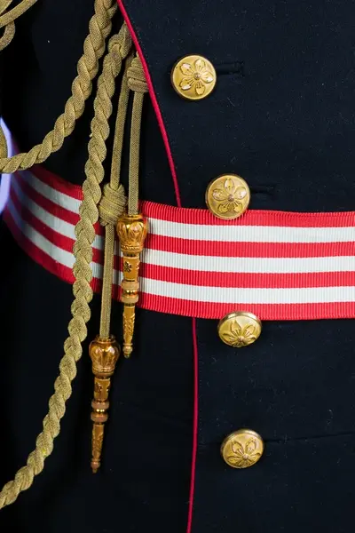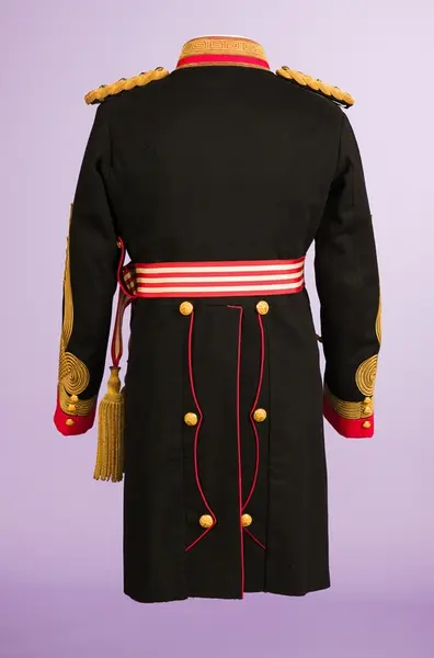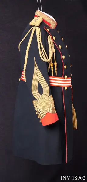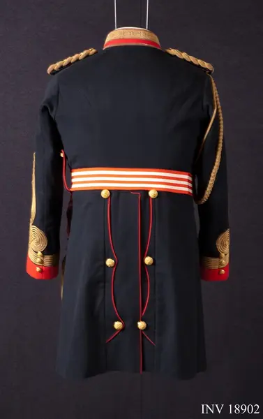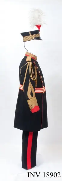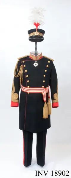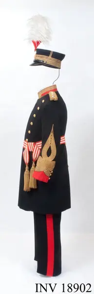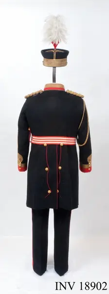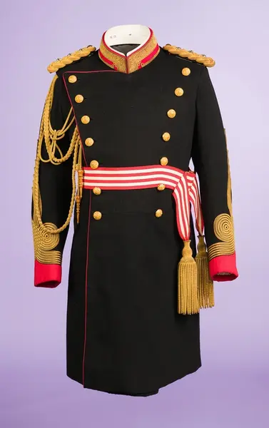 Ur paraduniform för överste vid Kejserliga Japanska arméns generalstab. Består av syrtut med axelklaffar, långbyxor, uniformsmössa med plym, ägiljett och paradskärp. 1880, Buren på 1930-talet.