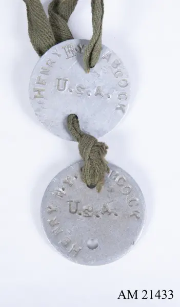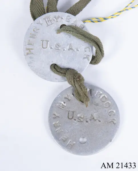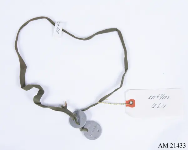 - Ur uniform för menig under 1. världskriget, USA. Består av vapenrock, byxor, overseas hat, skjorta, livrem, väska, gasmask, damasker, ammunitionsbälte, muddar, strumpor, identitetsbricka, plös, stålhjälm.