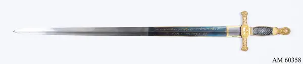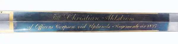 - Vapnet var en hedersgåva år 1827 till den dåvarande kaptenen vid Upplands regemente Ch. Ahlström från regementets officerskår.