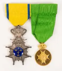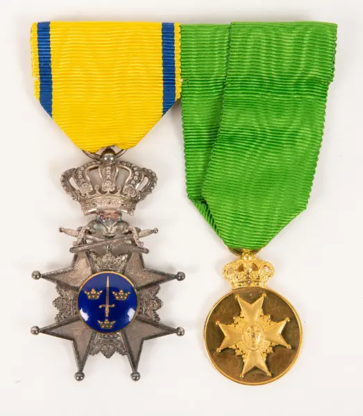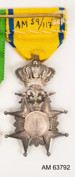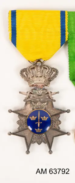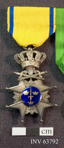 Svärdsmannatecken med band tilldelat styckjunkaren Georg Wilhelm Wessman. Ett snedställt johannitkors av silver. Åtta uddar, var och en slutande i en kula. Mellan korsarmarna öppna kronor. På åtsidan har tecknet en blå, emaljerad glob i korstets mitt med ett stolpvis ställt svärd och tre öppna kronor ställda två och...