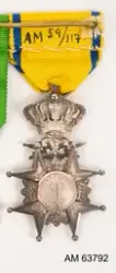 Svärdsmannatecken med band tilldelat styckjunkaren Georg Wilhelm Wessman. Ett snedställt johannitkors av silver. Åtta uddar, var och en slutande i en kula. Mellan kors...