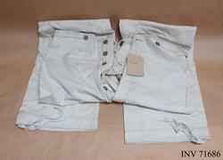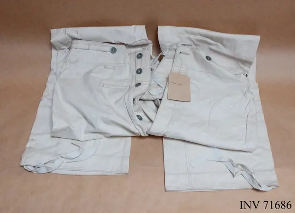 Långkalsongerna är 115 cm långa, har en bakficka på högra sidan och en mindre framficka för fickur samt ett tygband för att fästa urets kedja. De är tillverkade i kypertvävd bomulls och har bomullsband vid anklarna och i linningen samt knappar för hängslen och i gylfen. Knapparna är tillverkade i zink. De är på insidan märkta "B.A.G. 1903". Urfickan och bandet i linningen daterar dem till m/1903.