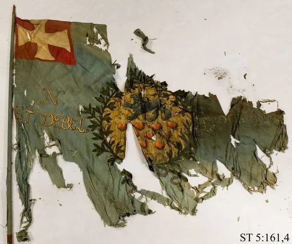 I 1685 års rustkammarinventarium är fanan listad under rubriken "Lundske Soldat Fahner" och beskrivs: "Blå tafttsfahna alt lika, med afbruten messingzspittz, desse orden: N. I. Et debellare ---- 1 st"