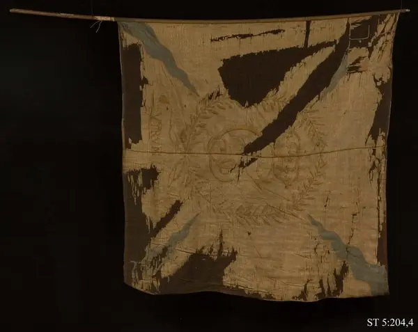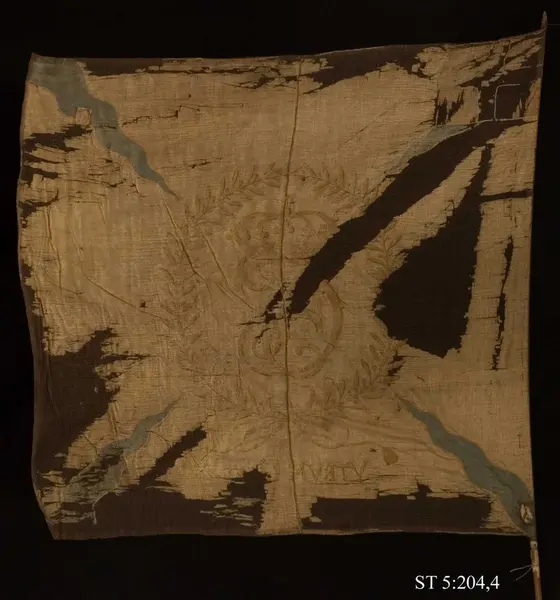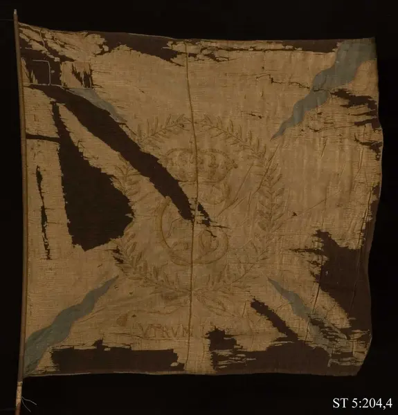 "Branguul tafttsfahna, uthan spittz, och medh afbruten Staka, der på är målat en förgyld lagerberkrantz, in uthi en stoor förgyld Crona, öfr. är C5 i alla fijre hörnen blå flammer, öffuerst i hörnet huitt korss i rött feldt, nederst står: Utrum libet, Lijka på begge sidor. 1 st"