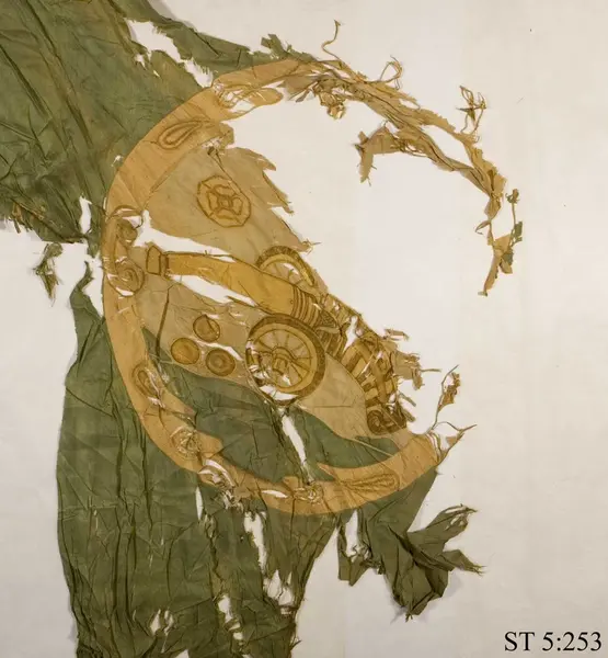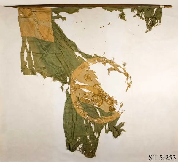 "Grön tafttsfahna medh en röd sydd krantz, der uthi ett sytt stycke medh tillhörige Laweter på grönt feldt, under Stycket äro 3:ne kuhlor, öfr. stycket 3 röda roossor i hwitt feldt: Et hat rationes in armis. Hwitt korss i rött feldt, är slagen på en pijk, något sönder. 1 st."