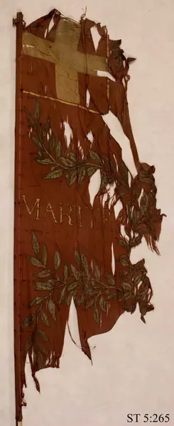 Fanan står inte listad som tagen vid Lund i 1685 års inventarium men däremot på en samtida förteckning som anses referera till troféerna från Lund. Där beskrivs den som följer: "Een gammall rööd: marte et arte"