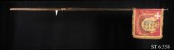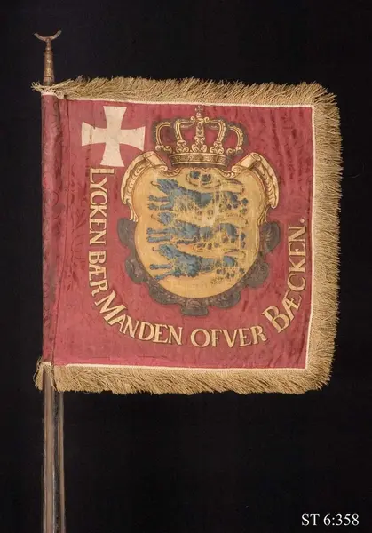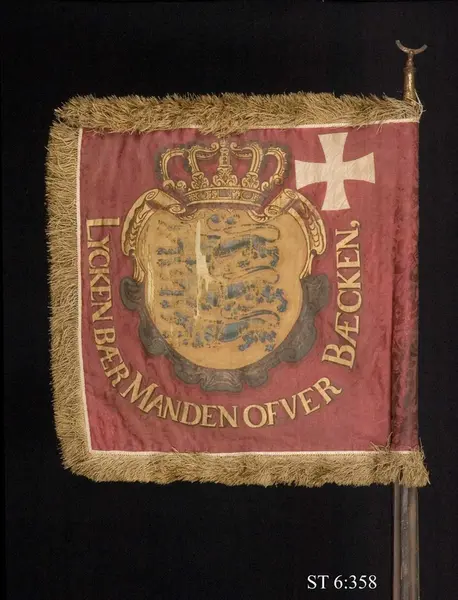 Standaret är tillverkat för det 8 kompaniet i 1:a Själländska nationella ryttarregementet under överste Hendrik Sehested.