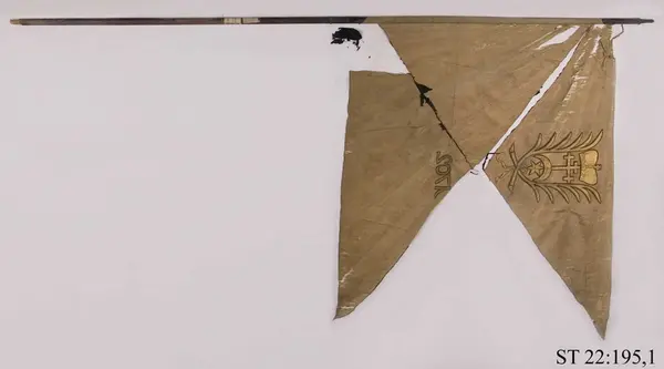 - Fanan togs som trofé av svenska trupper under slaget vid Jakobstadt (Jekabpils) i Kurland som stod den 26 juli 1704. Wisniowieckis trupper förlorade totalt 13 infanterifanor och sju standar till svenskarna.