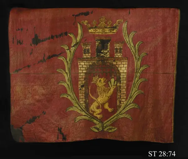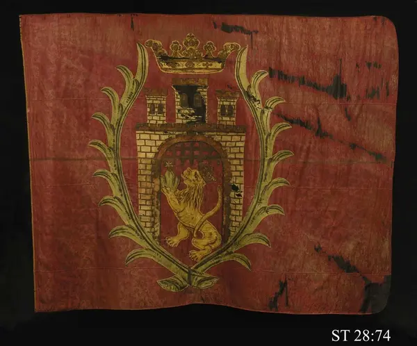 ”1.st. af rödt Damask: på duken målad en Fästningsport med en til hälften nedsläpt Hers, samt i själva porten et gult Leijon. Lika på båda sidor - Hel.”