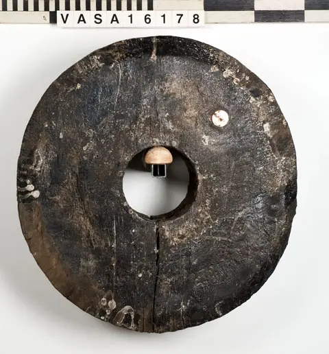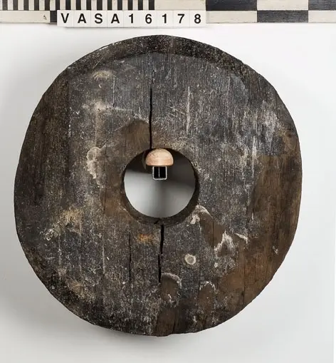 The truck is the wheel on which the gun carriage rolls. It is a solid wooden disk , sometimes with the edges lightly chamfered, with a circular hoel for the axletree in the centre. The hole is reinforced by an iron ring nailed to the outer face of the truck. In some cases, the truck is made of two pieces of wood, a thicker disk with a thinner disk nailed to its outer face. These may be trucks for lighter guns adapted to heavier carriages by increasing the thickness. All of Vasa’s gun carriages were built for four trucks on two axletrees.