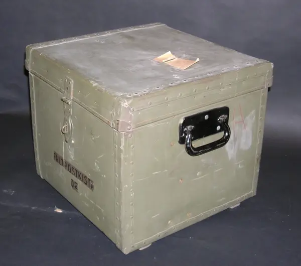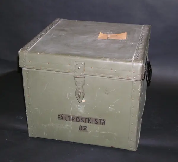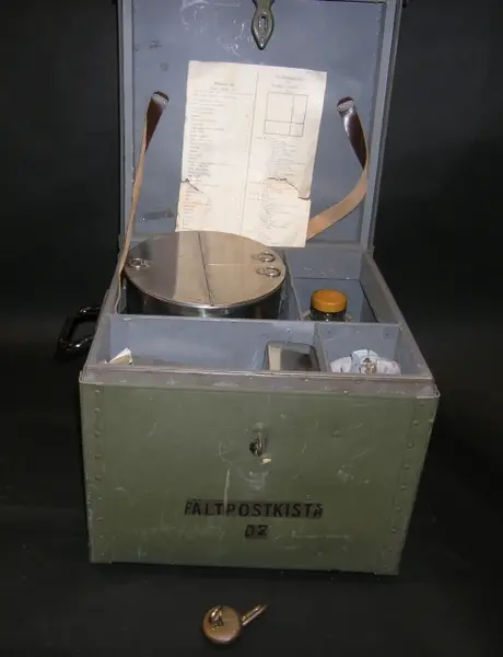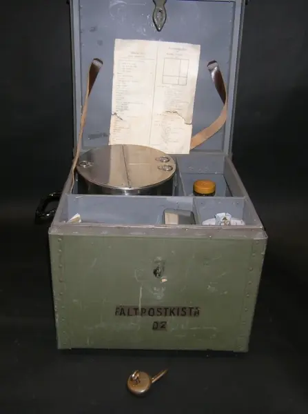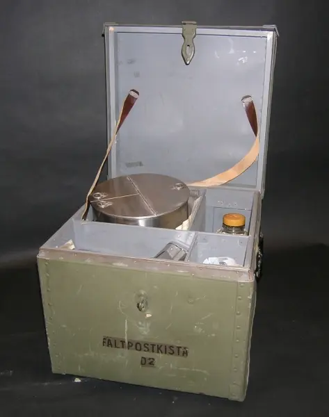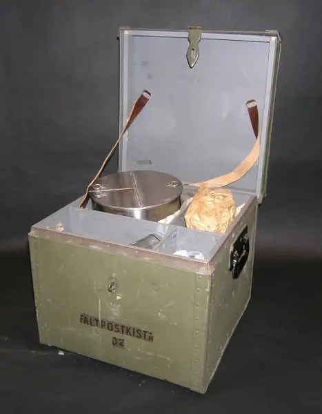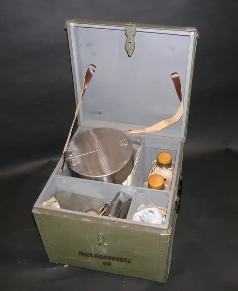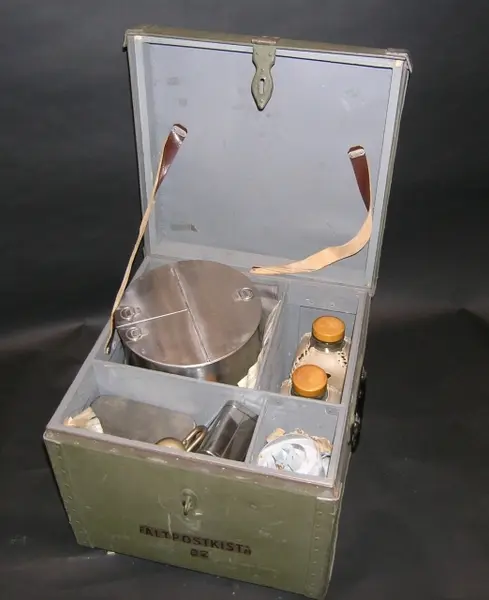 - Relaterade objektRunt hänglås med nyckel. Låset märkt PL (framsidan), och Optimus, Made in Sweden (baksidan). Innehållet förtecknat på ett A4-ark inuti kistan, dvs. en innehållsförteckning med packningsplan.I fack A finns: 1 st kastrull, i denna 1 st kittel, kok-, större, i denna 8 st tallrikar, på dessa 1 st kittel, kok-, mindre, i denna 1 st kanna, kaffe-, i denna 6 st bägare, i en av dessa 1 st dosa, strö-, och 2 st dosor för salt och kryddor. 1 st grepe, kokkittel, vid sidan om kaffekannan. 1 st lock