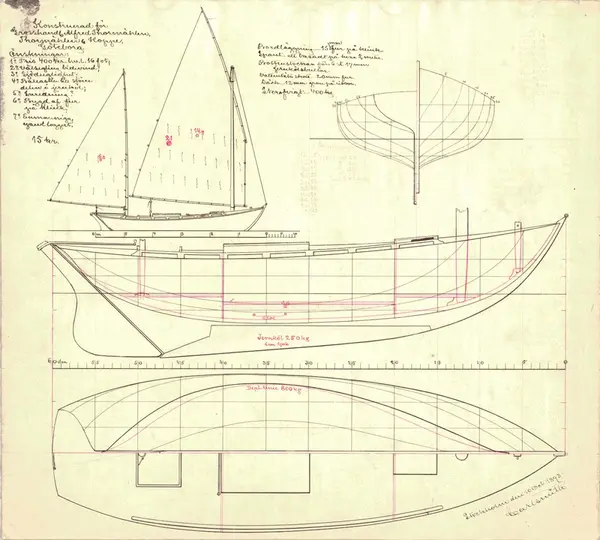 - Ritning till Emmerich, enmastad kölbåt med yawlloggert, ritad av Carl Smith.