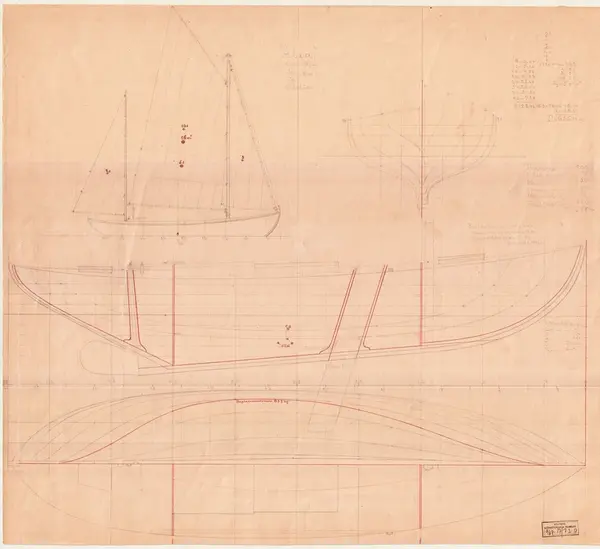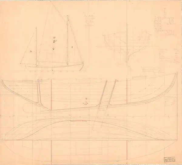 - Ritning till Alea, tvåmastad segelkanot med gaffelrigg och centerbord.
