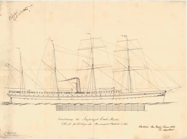 HistoryERNST MERCK byggdes på Nyköpings Mekaniska Verkstad 1858, konstruerad av G W Svenson. Bygget initierades av redaren Johan Holm, men finansierades av den österrikiska bankiren Ernst Merck. Hon var byggd av stål och hade såväl vattentäta skott som dubbel botten. Till hjälp vid lastning och lossning var hon utrustad med en lokomobil (en hjulförsedd ångmaskin) som gick på räls på fartygsdäcket. Fartyget, som var Nordens största ångfartyg och det största "järnångskepp” som dittills byggts i Sverige, fick namnet ERNST MERCK, men kallades allmänt "den svenska Leviathan” - Great Eastern, Englands Leviathan byggdes i dessa dagar. På en resa med en last av järnvägsvagnar till Rio, blev hon det första svenska ångfartyget som korsat ekvatorn.