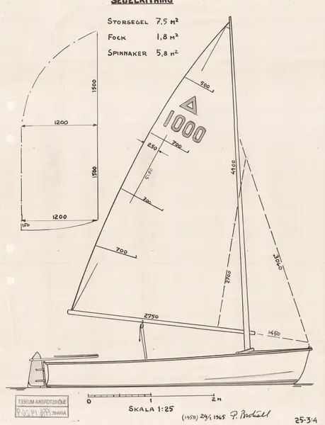- Ritning till TRISS, kombinerad rodd-, segel- och utombordsmotorbåt för ABC-fabrikerna, gjord av Per Brohäll.