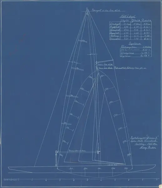 - Ritningen har fungerat som underlag till en segelbeställning i Örtengrens segelmakeri. Beställare Malte, Svennbeck. Beställningsnummer 403/30.
