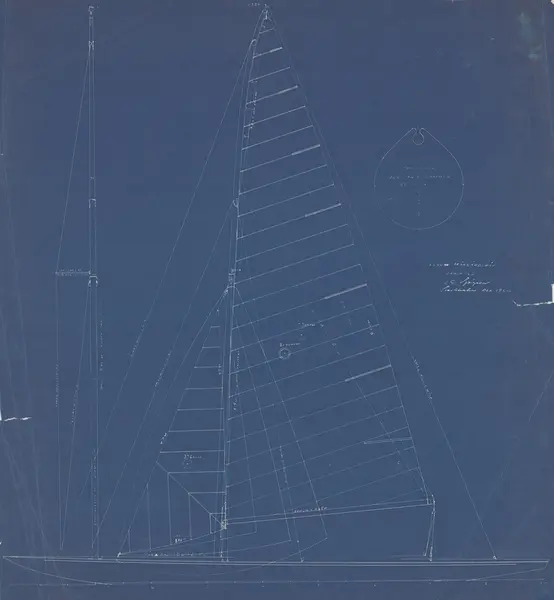 Ritningen har fungerat som underlag till en segelbeställning i Örtengrens segelmakeri. Beställare herr H. Andersson