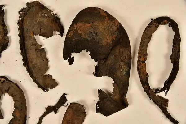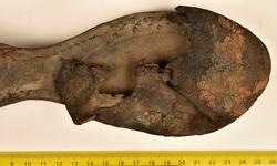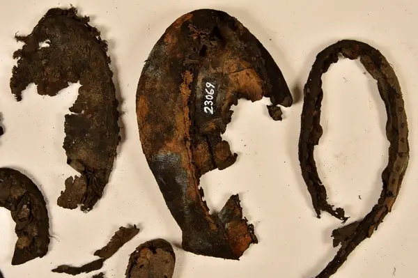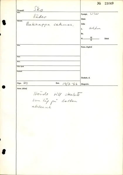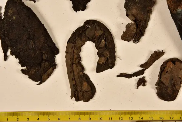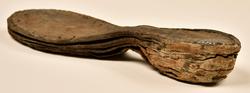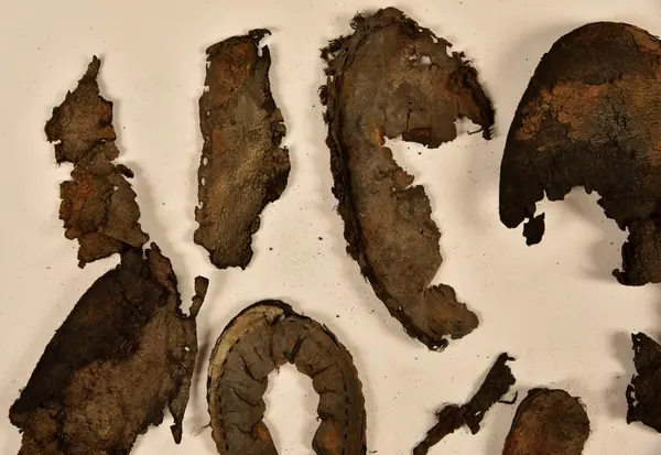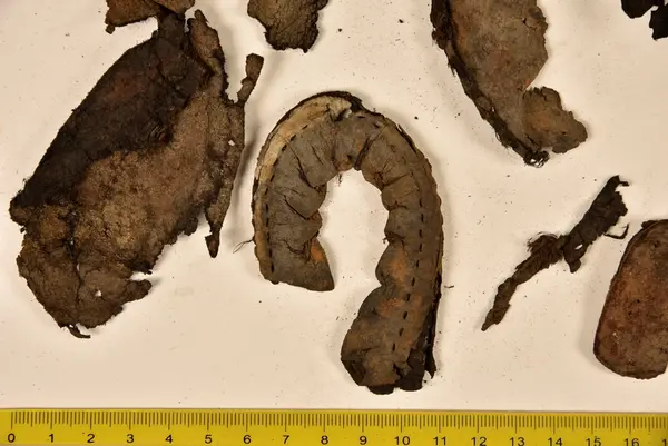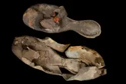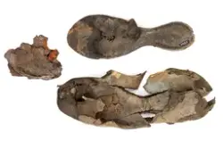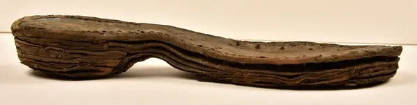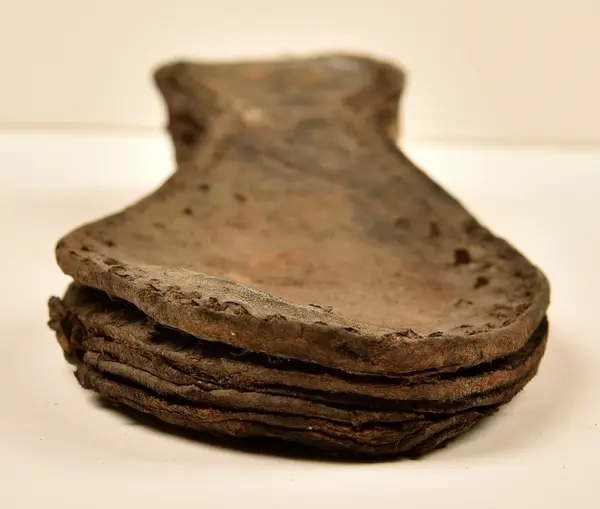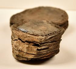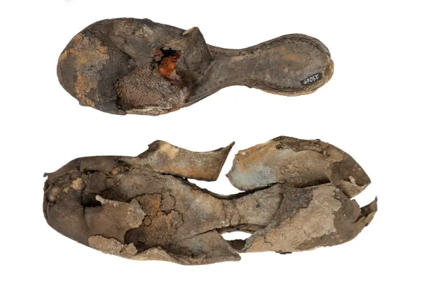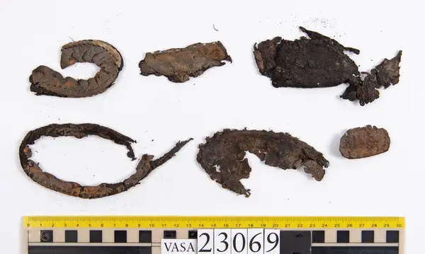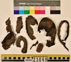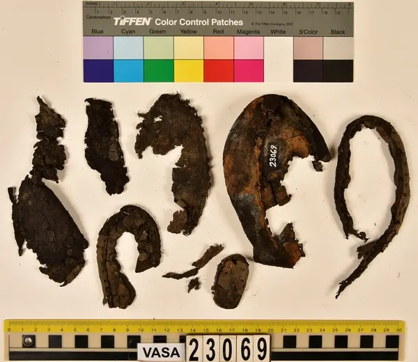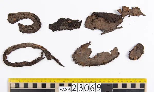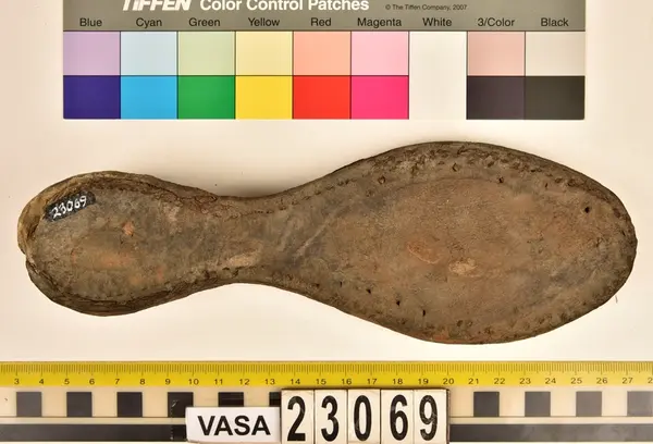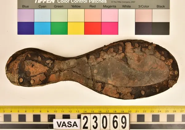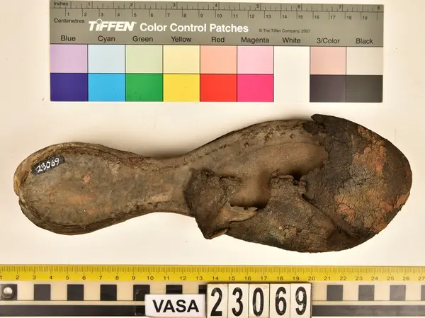 Well over 1400 shoe and boot parts have been found on Vasa. Between the end of the 16th century and the mid 17th century, three types of footwear dominated fashion. These were the latchet shoe, the boot and the pantable slipper, all of which are represented in the Vasa material. The latchet shoe was tied through two straps over the instep. The boot of the early 17th century had a closely fitted shaft of soft leather which could be turned down at the top. Slippers, also called pantables, lacked quarters and often had thicker soles of wood and cork. Some shoes were still made as distinct lefts and rights, although from ca 1580 it was increasingly common to make shoes on an “upright” or straight last, and the shoes would become matched to the left and right foot through wear. Elevated heels first gained popularity throughout western Europe in the late 16th century; before then shoes were flat soled. Both flat soles and elevated heels are seen in the Vasa shoes. Leather of various types could be used for any part of the shoe, but some shoes include birchbark midsole layers for insulation or waterproofing, and pantables often had wood and cork in the sole.
