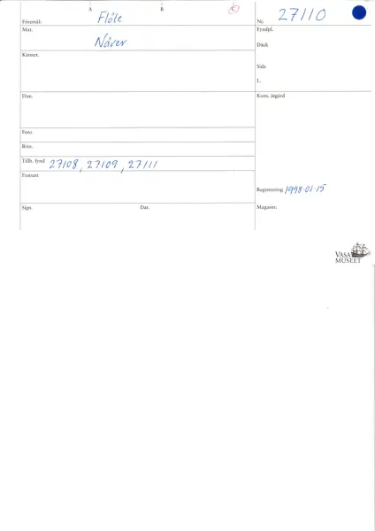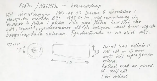 Vid inventeringen påträffades flötet tillsammans med tre andra onumrerade näverflöten. Med största sannolikhet bör flötena tillhöra ett och samma fynd, se även fyndnummer 27008-27109 samt 27011.