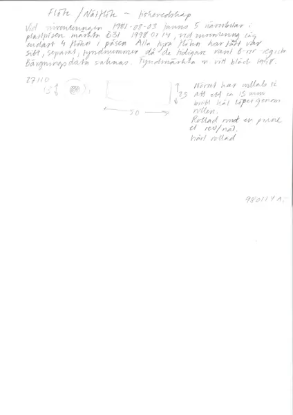 Vid inventeringen 1998 försågs föremålet med ett nytt fyndnummer. Uppgifter beträffande bärgningsdata saknas då flötet saknade ursprungligt fyndnummer.