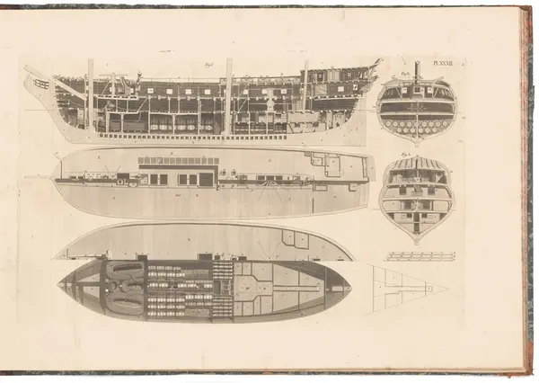Other information Originalbeskrivning: "Visar inredningen uppå Kaparen N:o 1. (Dvs den på plåt XXXI). Fig. 1. är en Section då den supponeras vara skuren Verticalt igenom medellinien af Kjöl och Stäfvar. Fig. 2. är en Vertical Section af samma Kapare, at se förut, då Skeppet är tvärs afskurit vid O Spantet eller bredaste stället. Fig. 3. är en Vertical Section at se Ackter-ut, då skeppet är afskurit midt igenom Krut-Magazinet.