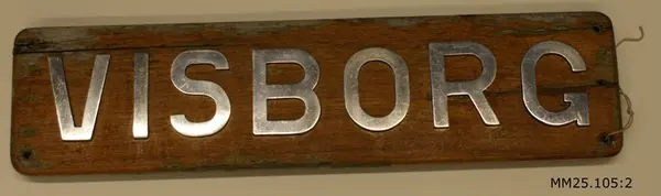 Användning: Namnbrädan har suttit på brygghuset på HMS Visborg och utvisat fartygets namn.