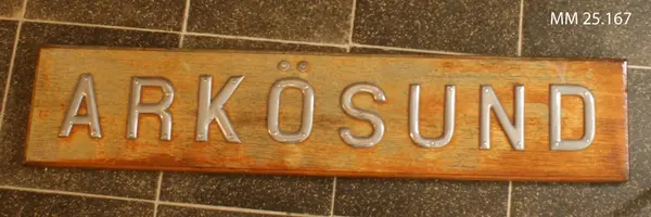 Användning: Namnbrädan har suttit på minutläggaren Arkösund med igenkänningsbeteckningen MUL 12.