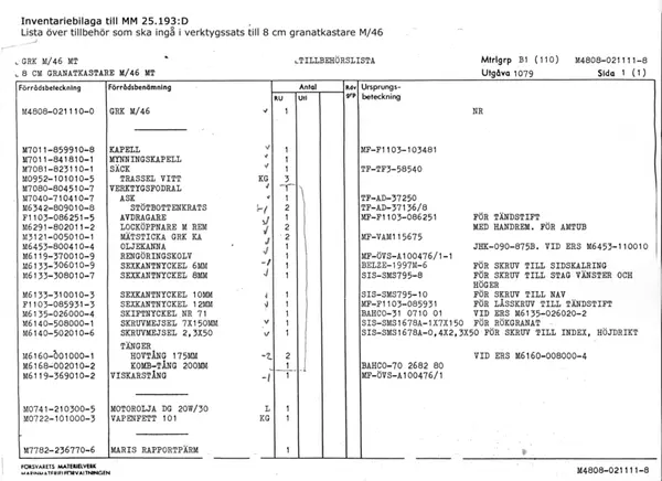 - HänvisningBeskrivning över 8 cm granatkaster m/46. Utarbetad av kungliga Marinförvaltningen. Förvaras som militärtryck i Marinmuseums bibliotek samt i inventariebilaga (kopia).