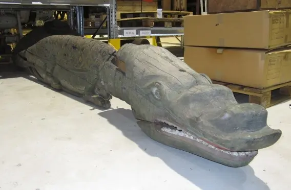 - Föremålet har legat ute på Albert Engströms sommarställe hemmanet Augustenberg i Grisslehamn. Engström köpte stället efter sjökapten och pensionatsägare Hans August Lindström 1902 och då låg krokodilen där. 1943 då museet fick föremålet hämtades den där.