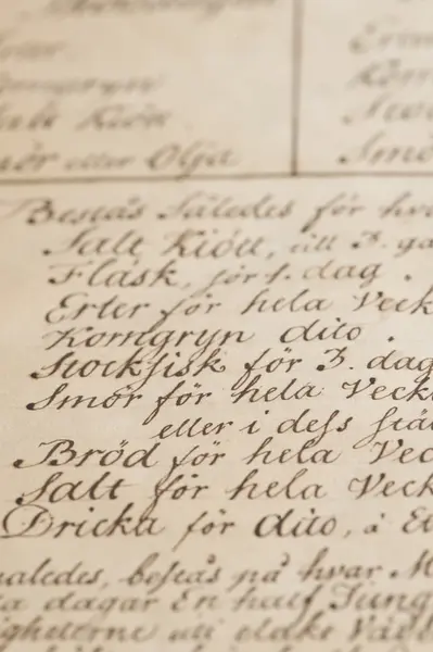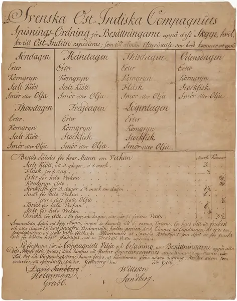 "Matsedel för ostindiefarare från 1766. Veckans matsedel var bestämd i förväg. På tisdagar fick besättningen exempelvis ärtor, korngryn, fläsk samt smör eller olja. När vädret var dåligt fick de en större ranson brännvin än vanligt."