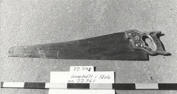 - Utseendemässigt stämmer den väl med de sågar Sandvik tillverkade. Deras sågtillverkning startade 1885. Sågen kom till museet 1969 från Örlogsbas ost och skall enligt registeruppgifter ha funnits i ett verkfat (timmermanskista) som använts på pansarskeppet GUSTAV V. Fartyget, sjösattes 1922 och avrustades 1948. Det troligaste är att sågen är tillverkad omkring tiden för sjösättningen. Handtagets ornamentik (kvardröjande stil:drakslingor) och teknik (lamineringen) talar också för detta.