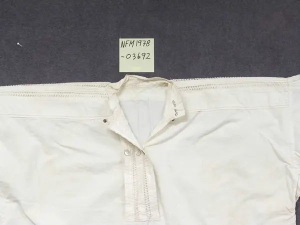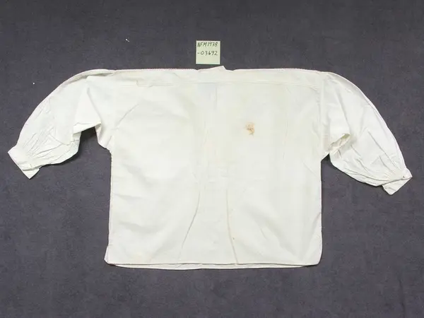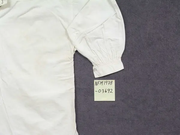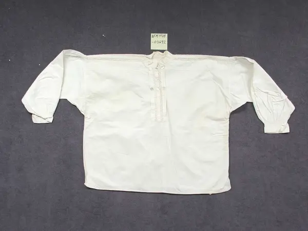 Brudgomsskjorte. Kort i livet, isydde erme. Det er sydd på pyntestykke med opning og krokalisser på skuldra. Framme er det same dekor på brysttykke som fungerer som opning. Det er også sydd på sju pynteknappar på brysttykket. Lukking med liten knapp og hempe og trykknapp øvst. Liten ståande krage. Knapping på ermlining.