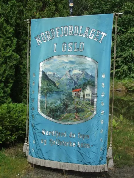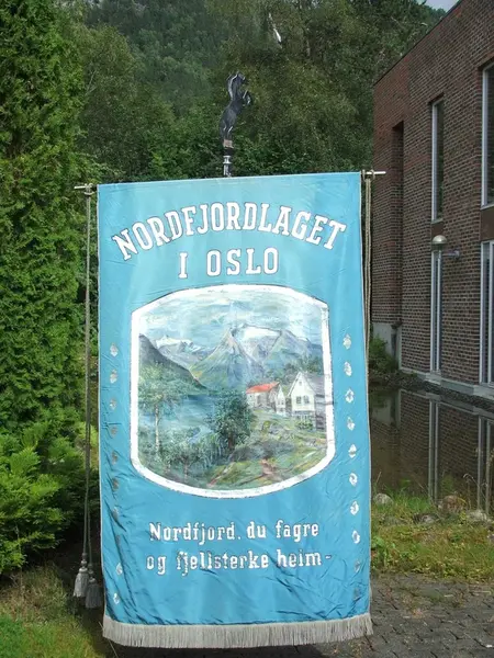 - Frå Nordfjordlaget i Oslo. Laget vart skipa 27.mars 1915. I 1987 vart Nordfjordlaget ein del av Sogn og Fjordane-laget. Fana er måla av Ingebrigt Beinnes, og han fekk oppdraget i 1936. Avdukinga skjedde ved 25-års jubileet i mars 1940, berre nokre dagar før krigen braut ut. Skissa til fana er laga av kunstnaren Jostein Øvrelid. Motivet er, med nokre endringar, frå Hjelle i Oppstryn med utsyn mot Breifonna og Storskrefjellet.